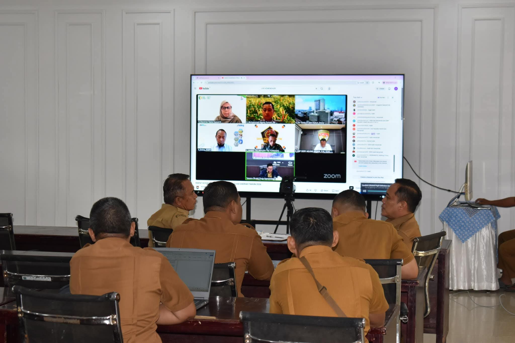 Dinas Kominfo Kota Sibolga | SIBOLGA – Pemerintah Kota (Pemko) Sibolga mengikuti Rapat Koordinasi (Rakor) Pengendalian Inflasi Tahun 2026 yang dirangkaikan dengan Sosialisasi Jaminan Produk Halal. Kegiatan ini diselenggarakan oleh Kementerian Dalam Negeri (Kemendagri) secara virtual melalui zoom meeting dan diikuti dari Aula Nusantara I, Kantor Wali Kota Sibolga, pada Senin (23/02/2026) pagi.