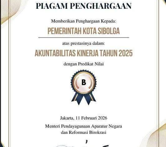Penghargaan tersebut diberikan kepada Pemerintah Kota Sibolga berdasarkan hasil evaluasi Sistem Akuntabilitas Kinerja Instansi Pemerintah (SAKIP) Tahun 2025, dan diserahkan langsung oleh Menteri PAN-RB, Rini Widyantini, dalam acara penganugerahan yang digelar di Aula Kementerian PANRB, Jalan Jenderal Sudirman Kav. 69, Jakarta Selatan, pada Rabu (11/02/2026).