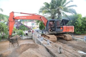 Walikota Sibolga Akhmad Syukri Nazry Penarik, bersama Wakil Wali Kota Sibolga Pantas Maruba Lumban Tobing, didampingi JFT Analis Kebencanaan Ahli Media BNPB Gatot Satria Wijaya, tinjau langsung dan Kerahkan Ekskavator untuk mengorek Sungai Aek Doras agar airnya dapat mengalir dan tidak meluap, pada Senin (01/12/2025).