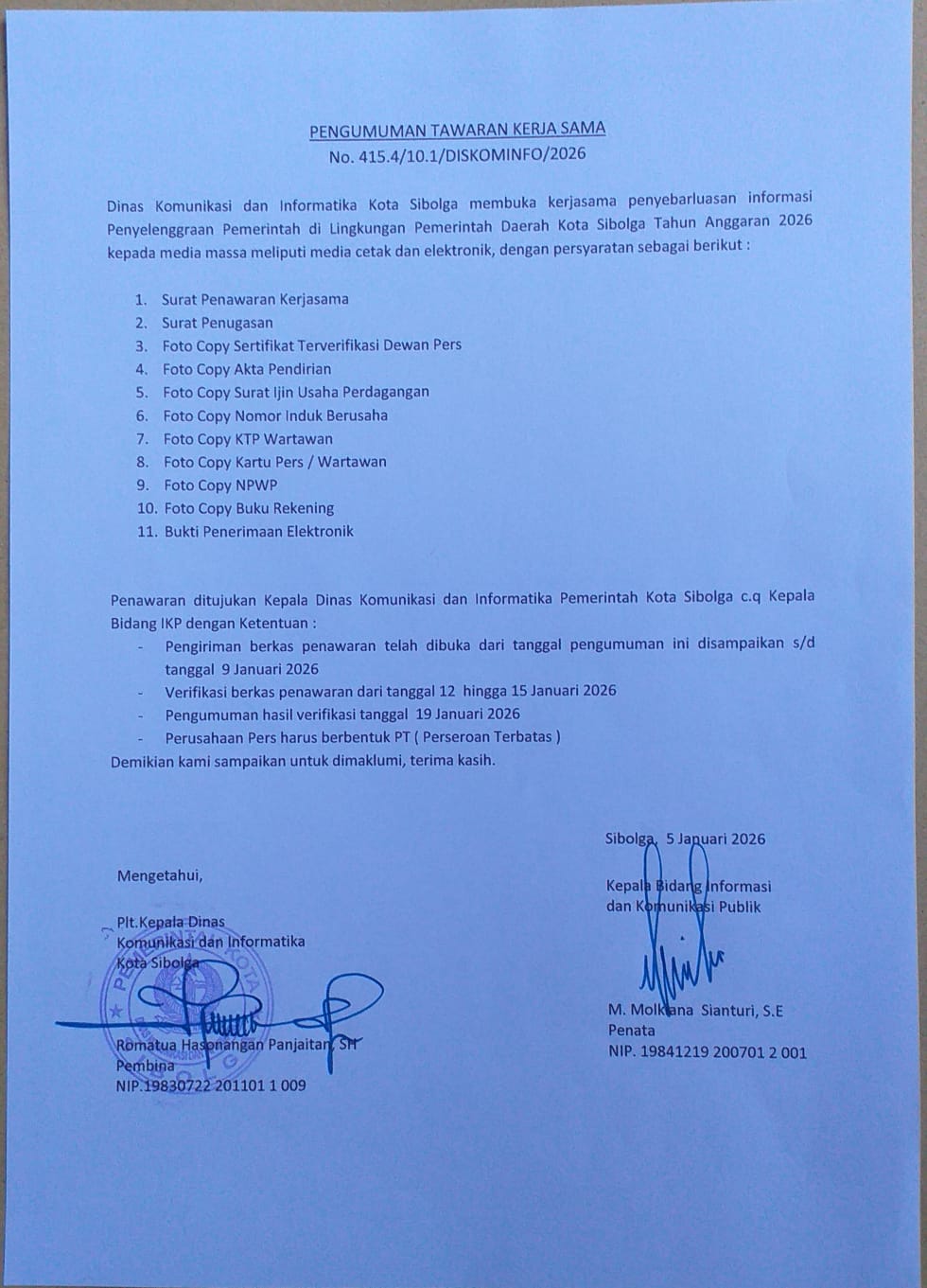 Dinas Komunikasi dan Informatika Kota Sibolga membuka kerja sama penyebarluasan informasi Penyelenggaraan Pemerintah di Lingkungan Pemerintah Daerah Kota Sibolga Tahun Anggaran 2026 kepada media massa meliputi media cetak dan elektronik, dengan persyaratan sebagai berikut: