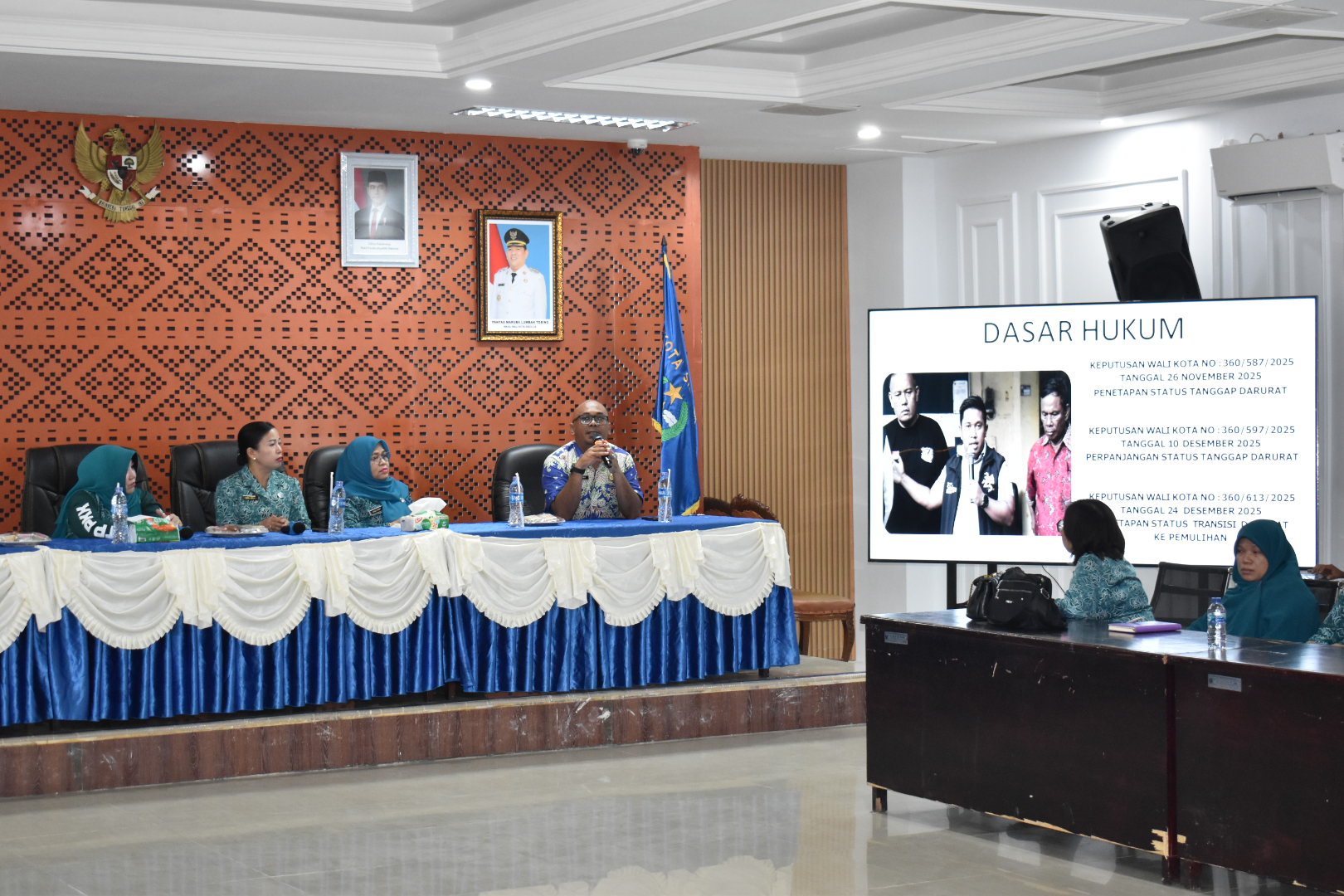 Pemko Sibolga juga memaparkan langkah-langkah penanganan darurat bencana longsor dan banjir yang terjadi pada 25 November 2025, mulai dari penetapan masa tanggap darurat hingga 23 Desember 2025 dan masa transisi pemulihan hingga Maret 2026. Upaya lainnya meliputi pengoperasian dapur umum melalui pengalihan Program Makan Bergizi Gratis (MBG), pemanfaatan handy talky untuk menjaga koordinasi antar-OPD, percepatan layanan administrasi kependudukan bagi warga terdampak, serta pembangunan hunian tetap melalui kolaborasi dengan Kementerian PKP dan Yayasan Buddha Tzu Chi Indonesia.