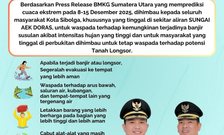 Berdasarkan prediksi dari BMKG Sumatera Utara, cuaca ekstrem diperkirakan terjadi pada 8-15 Desember 2025. Dihimbau kepada seluruh masyarakat Kota Sibolga, khususnya yang tinggal di sekitar aliran Sungai Aek Doras, untuk waspada terhadap kemungkinan terjadinya banjir susulan akibat intensitas hujan yang tinggi.